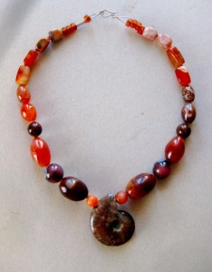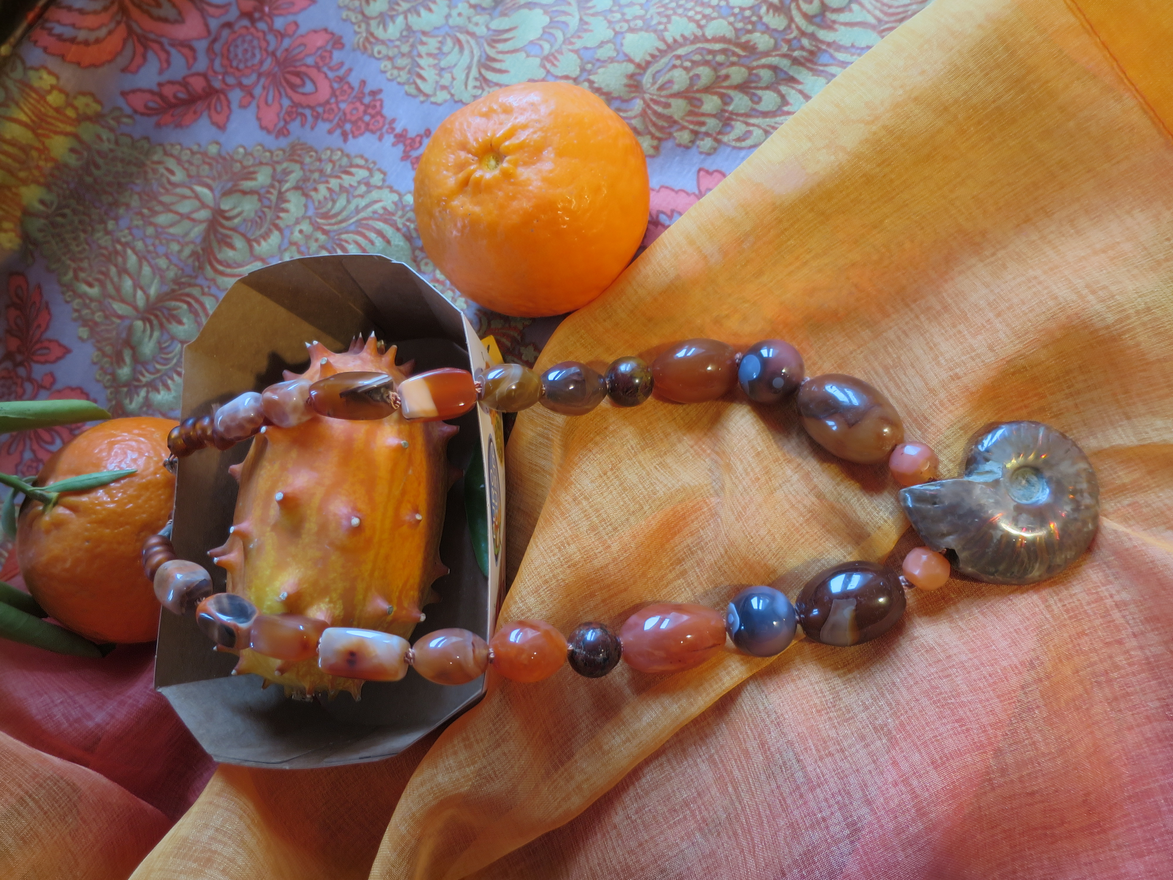 Collier mi-long. Amommite irrisée du Maroc. Cornaline ancienne et contemporaine.Agate. Vénitienne.